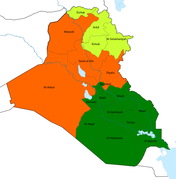 December 2005 legislative elections by vote distribution: Green – United Iraqi Alliance (Shia, 41.2 per cent), Orange – Tawafuq (Sunni, 15.1 per cent), Yellow – Democratic Patriotic Alliance of Kurdistan (Kurdish, 21.7 per cent). Source: Work of Kermanshahi put into svg format by MrPenguin20.